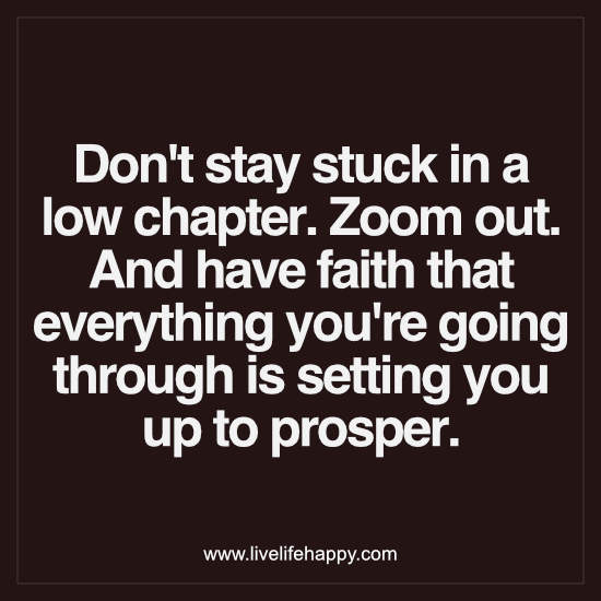 Don’t Stay Stuck in a Low Chapter November 7, 2016 By LLH Leave a Comment Deep Life Quote: Don’t stay stuck in a low chapter. Zoom out. And have faith that everything you’re going through is setting you up to prosper.