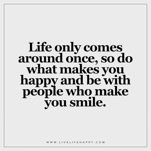 Life Only Comes Around Once August 27, 2016 By LLH Leave a Comment Deep Life Quote: Life only comes around once, so do what makes you happy and be with people who make you smile. – Unknown