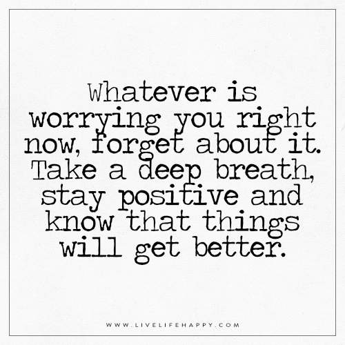 Whatever Is Worrying You Right Now October 1, 2016 By LLH Leave a Comment Deep Life Quote: Whatever is worrying you right now, forget about it. Take a deep breath, stay positive and know that things will get better. – Unknown